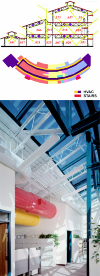 Mechanical air-handling equipment is located outside the building perimeter of the complex. In-floor distribution system provides the building with power, lighting, electronic and communications capabilities. The building is capable of being altered to suit the changing needs of the users.