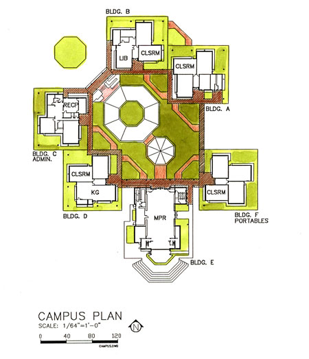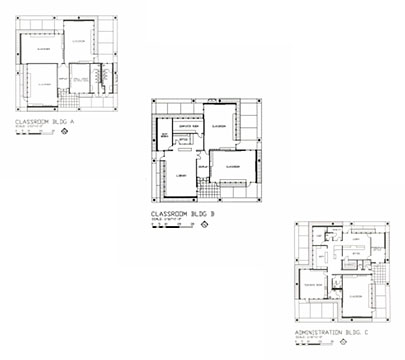 Classroom buildings A, B and C have the same long span structural system Open Space is subdivided to respond to functional need