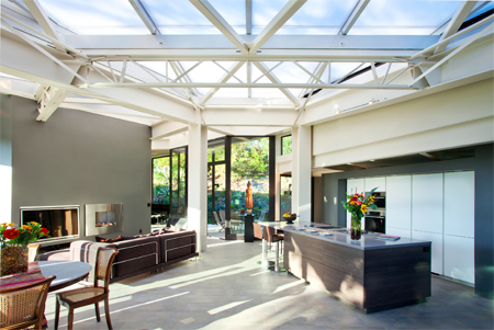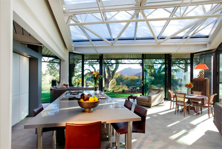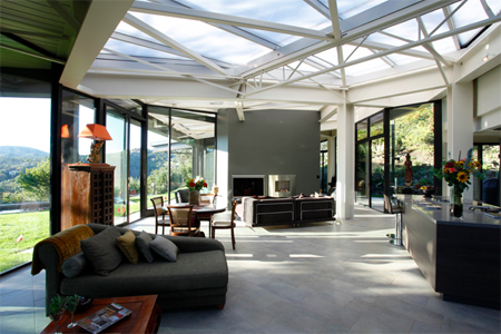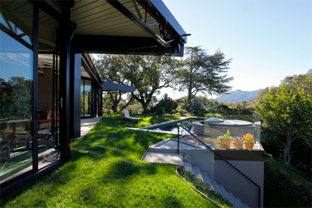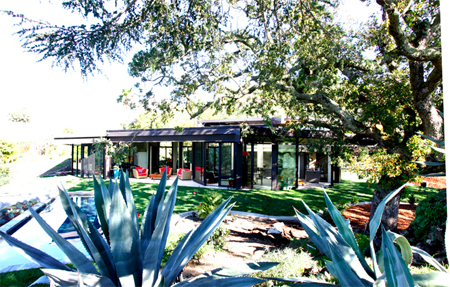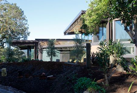 Protecting the natural environment requires significant understanding of ecosystems’ interrelations. The lead Architect Fani Danadjieva Hansen together with the Owners studied the site and its features and created a design that maximizes the indoor connection to the surrounding environment. The footprint preserves permeable land. Each room is arranged in such a way as to take advantage of a unique view – Mr. Tamalpais, grassy golden hills decorated with rocks and native plantings and a grove of mature oak trees. The modular roof varies in opacity and acts as a parasol over the building and courtyard spaces in between volumes for shaded relief from dry hot summer days.