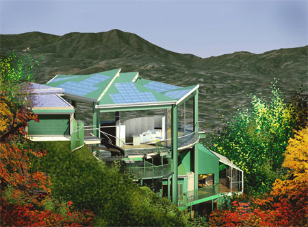 To take full advantage of solar radiation that hits a very small portion of the site the Architect Fani Hansen created a sunflower design that collects most effectively solar energy for living use. The all steel structure with high-performance glazing on all sides provides natural ventilation throughout. In its lofty-setting, the placement and orientation takes advantage of 360 degree sweeping hillside and valley views.